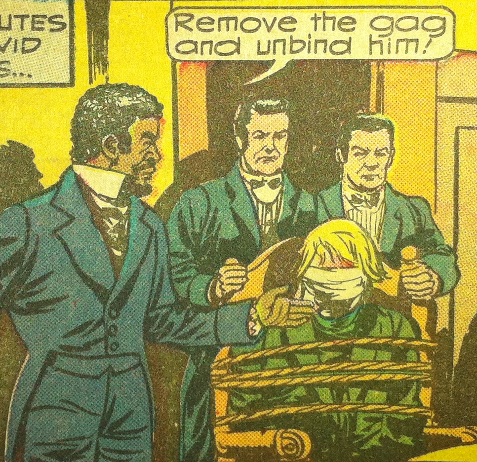 | Classics Illustrated #44 | Mysteries of Paris | Wertham criticized this comic in his 1948 article in the Saturday Review of Literature. In one of the 'good' comic books, ('Classics Illustrated') in a rendering of the novel by Eugene Sue, The Mysteries of Paris, there is a picture of a man tied down to a chair-- a man whose eyes have been gouged out and whose blood runs down from beneath the bandage. Wertham also mentioned this comic is the text of SOTI, p. 323. I had written that in the "good" comic book The Mysteries of Paris blood shows beneath the bandage of a man whose eyes have been gouged out. The publisher demanded a retraction. But I stood my ground, because the blood was there. |  |